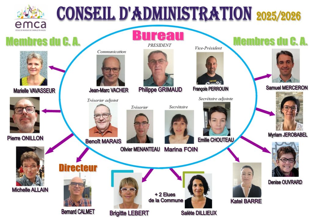 L’Ecole de Musique de Chemillé-en-Anjou est une association type loi 1901 gérée par un Conseil d’Administration composé d’adhérents bénévoles et de deux élus de la Commune Nouvelle.